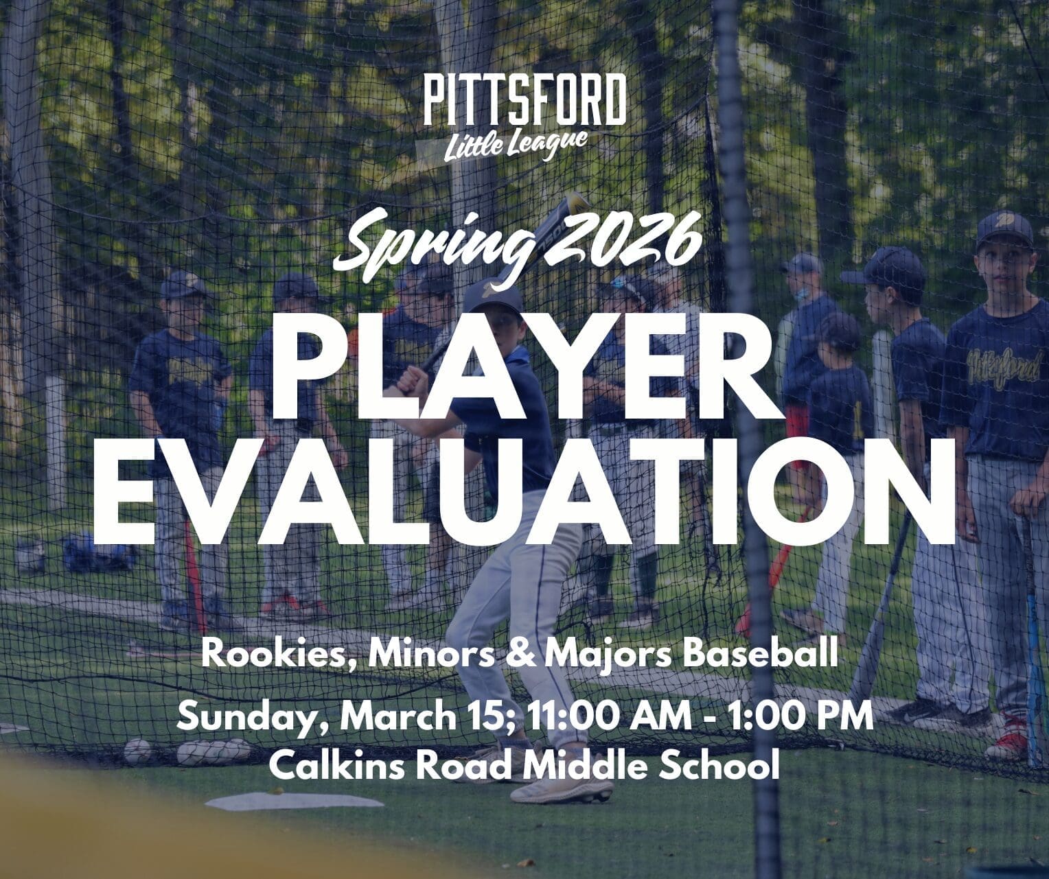This is a reminder to the registrants in the Pittsford Little League Rookies, Minors, and Majors baseball programs for the Spring 2026 season that our player evaluation will be held on Sunday, March 15th, in the gymnasium of Calkins Rd Middle School. Players should drop in when it’s convenient between 11:00 am and 1:00 pm.…